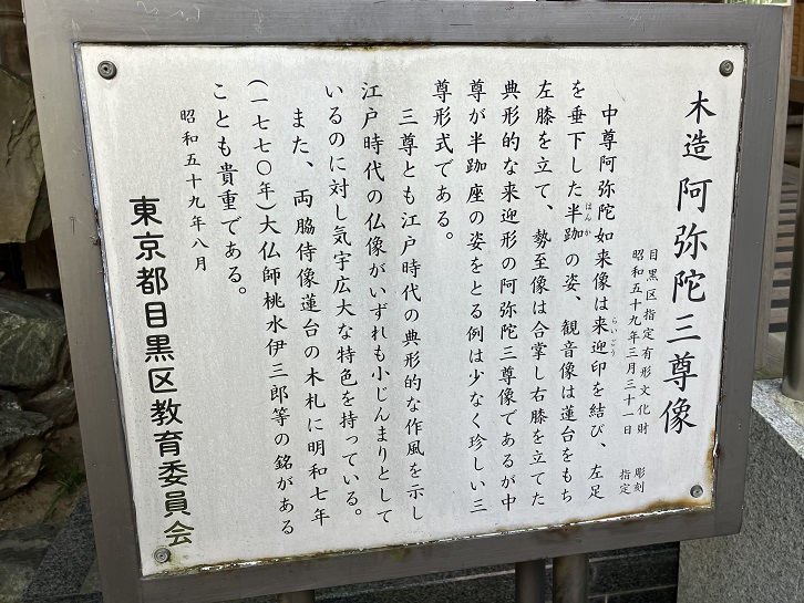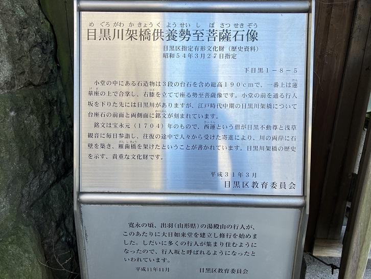小堂の中にある石造物は3段の台石を含め総高190cmで、一番上は蓮華座の上で合掌し、右膝を立てて座る勢至菩薩像です。小堂の前を通る行人坂を下りた先には目黒川がありますが、江戸時代中期の目黒川架橋について台座石の前面と両側面に銘文が刻まれています。銘文は宝永元年(1704年)のもので、西運という僧が目黒不動尊と浅草観音に毎日参詣し、往復の途中で人々から受けた寄進により、川の両岸に石壁を築き、雁歯橋(現在の太鼓橋)を架けたということが書かれています。目黒川架橋の歴史を示す、貴重な文化財です。