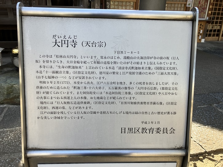この寺は「松林山大円寺」といいます。寛永のはじめ、湯殿山の大海法印が寺の前の坂(行人坂)を切りひらき、大日金輪を祀って祈願の道場を開いたのがその始まりと伝えられています。本寺には、”生身の釈迦如来”と言われている木造「清涼寺式釈迦如来立像」(国指定文化財)、木造「十一面観音立像」(区指定文化財)、徳川家の繁栄と江戸発展守護のための「三面大黒天像」(山手七福神の一つ)などが安置されています。明和九年(1772年)2月本堂から出火、江戸六百余町を焼き、多くの死者を出しましたが、その供養のために造られた「釈迦三尊・十六大弟子、五百羅漢の像等の「大円寺石仏群」(都指定文化財)が建てられています。また阿弥陀堂には「木造阿弥陀三尊像」(区指定文化財)や八百や(屋)お七の火事にまつわる西運上人の木像、お七地蔵などが祀られています。境内には「行人坂敷石造道供養碑」(区指定文化財)、「目黒川架橋供養勢至菩薩石像」(区指定文化財)、西運の墓、などがあります。江戸の面影を残している行人坂の景観や老樹古木のしげる境内は緑の自然と古い歴史が薫る静かな美しい浄域を守っています。