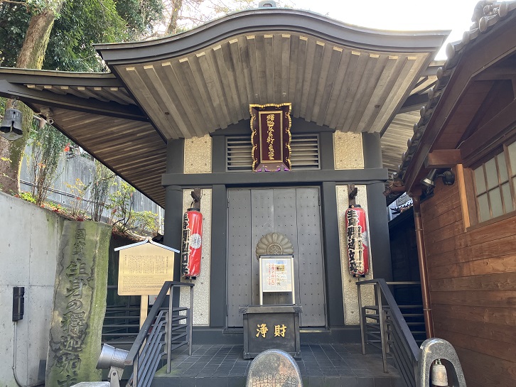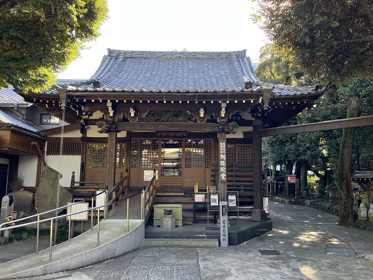 大円寺は、寛永年間(1624年〜1644年)に湯殿山修験道の行者大海が創建したと伝えられています。明和九年(1772年)2月に発生した大火(明和の大火・行人坂火事)の火元となった寺であることから、幕府から再建の許可がなかなか得られませんでした。江戸時代後期の嘉永元年(1848年)になって薩摩藩主島津斉興の帰依を得て、その菩提寺としてようやく再建されました。大円寺の正面本堂には、江戸城裏鬼門にあたることから徳川家康をモデルにした「大黒天」が祀られ、「江戸の三大黒天」として崇拝されています。大黒天は七福神のひとつで、狩衣に似た服を着て大黒頭巾をかぶり、左肩に大袋を背負い、右手に打ち出の小槌を持ち、米俵の上に座る神様です。ご利益には、五穀豊穣・子孫愛育・出世開運・商売繁盛などがあります。