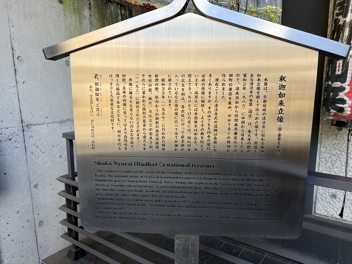The statue is a replica of the statue of the Standing Shaka Nyorai (Budha) in Seiryou-ji, Saga part of Kyoto. The original statue at Seiryo-ji (a national treasure) was brought from China in 986 by the Buddhisim priest Chonen from Todai-ji, Nara. Among the replicas in the Seiryo-ji style, the statue in Daien-ji resembles the original one. A gem is fitted into his hair. His robe is carved in concentric rings. At the time the statue was made. Kirikane (traditional decorative technique using gold foil) line patterns were along the rings. This replica has the most details. When this statue was taken apart and repaired in 1957, a mirror, women's hair, pieces of paper and wooden tags were found inside. According to the inscription on those articles, it was found that this statue was made in 1193.