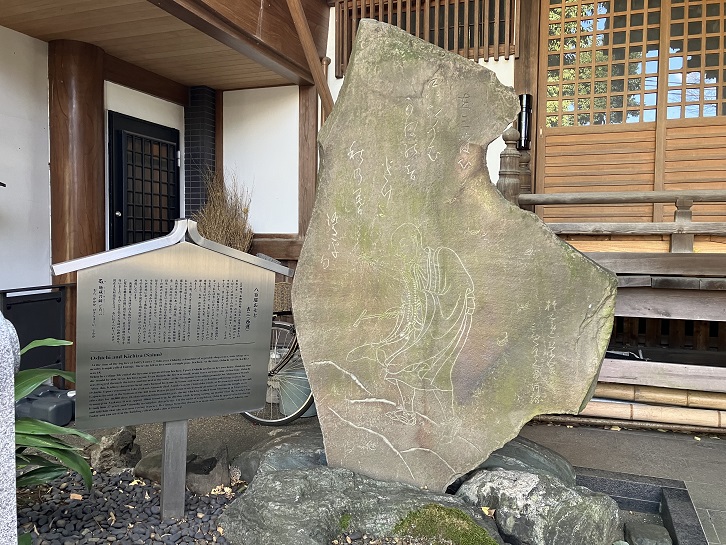 大円寺は八百屋お七の情人吉三ゆかりの寺でもあります。吉三とは歌舞伎や芝居などで知られる八百屋お七が恋した寺小姓です。吉三に逢いたいあまり自宅に火を放ってしまったお七は放火の罪で火刑に処されてしまいます。お七の処刑後、出家した吉三は西運と名を改め、大円寺の下(今の雅叙園の一部)にあった明王院に身を寄せると、明王院境内に念仏堂を建立するための勧進とお七の菩提を弔うために目黒不動と浅草観音までの往復十里の道のりを念仏を唱えながら通うという一万日の行を発願しました。雨の日も風の日も、首から下げた鉦をたたき、念仏を唱えながら日参し、27年5か月をかけてこれを成し遂げました。その夜に西運の夢枕にお七が現れます。その時の姿を模したのがお七地蔵で、明治初めごろ廃寺になって大円寺に吸収された明王院から仏像などと共に移され、阿弥陀堂の中に阿弥陀三尊と共に安置されています。ちなみにお七のお墓は文京区にある円乗寺に、お七の苦しみを代受苦としてその身に受けているほうろく地蔵は文京区の大円寺にあります。西運に深い関心を持っていた大円寺の住職であった福田実衍師は、昭和十八年に大円寺に念仏堂を再建した際、万葉集出画撰を描いた大亦観風画伯に「お七吉三縁起絵巻」を描いてもらいましたが、その一部が木枯らし吹きすさぶ中を念仏鉦を力一杯たたき念仏を唱えながら、日参する西運の姿を刻んだ碑となり、境内に建っています。