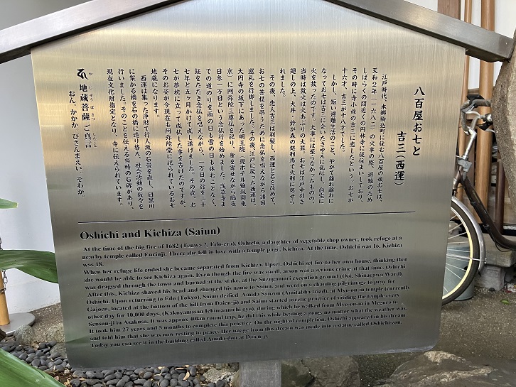 At the time of the big fire of 1682 (Tenwa 2, Edo-era), Oshichi, a daughter of vegetable shop owner, took refuge at a nearby temple called Enrinji. There she fell in love with a temple page, Kichiza. At the time, Oshichi was 16, Kichiza was 18.