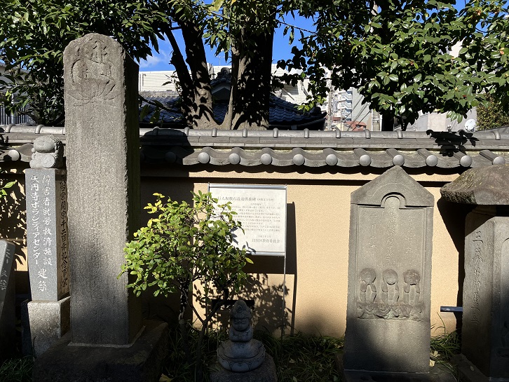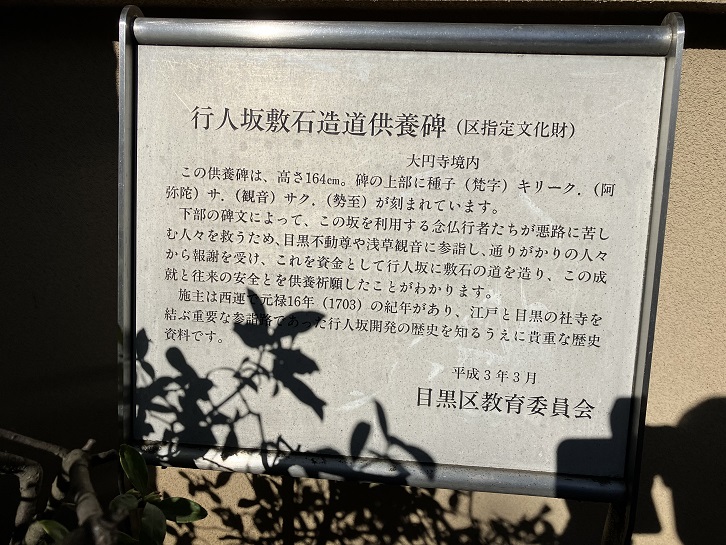 この供養碑は、高さ164cm。碑の上部に種子(梵字)のキリーク(阿弥陀如来)、サ(観音菩薩)、サク(勢至菩薩)が刻まれています。下部の碑文によって、この坂を利用する念仏行者たちが悪路に苦しむ人々を救うため、目黒不動尊や浅草観音に参詣し、通りがかりの人々から報謝を受け、これを資金として行人坂に敷石の道を造り、この成就と往来の安全とを供養祈願したことがわかります。施主は西運で元禄十六年(1703年)の紀年があり、江戸と目黒の社寺を結ぶ重要な参詣路であった行人坂開発の歴史を知るうえに貴重な歴史資料です。(一部改変しました)