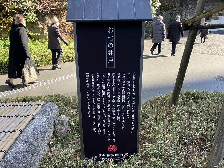 雅叙園の入口脇に、「お七の井戸のシダレザクラ」と呼ばれている一本の桜の木が植えられています。樹高は7メートル・枝張りは6メートル・幹周りは1メートルの八重紅枝垂れ桜で、しだれ桜の中でも特に人気の高いエドヒガン系の品種です。この明王院境内の井戸で西運が念仏行に出かける前にお七の菩提を念じながら、水垢離をとったことから「お七の井戸」と言い伝えられています。