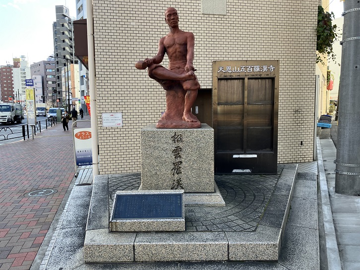 山手通りから道路が分岐する角に、「松雲羅漢」と台座に書かれた銅像が建っています。その前に解説のプレートを埋め込んだ碑が置かれています。松雲禅師って、筋骨隆々のマッチョな体をしていますね。