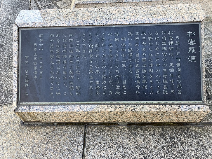 天恩山五百羅漢寺の開基松雲禅師は、元禄年中、五代将軍綱吉公の生母桂昌院をはじめ江戸中の人びとから寄せられた浄財をもとに五三六体の羅漢像を彫刻し、本所五ツ目に五百羅漢寺を築いた傑僧である。明治四十二年、下目黒に移転してきたのち寺は荒廃の一途を辿っていたが、多くのかたがたのご協力により、昭和五十六年、由緒ある五百羅漢寺を再建することができた。この再興を記念し、彫刻家佐山道知氏に制作依頼して松雲禅師像を建立し、これを松雲羅漢と名づけて禅師の徳を讃えるものである。