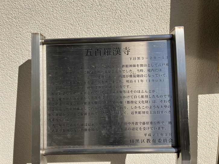 天恩山五百羅漢寺は 元禄八年(1695年)鉄眼禅師を開山として江戸本所(現、江東区大島)に創建された黄檗宗の寺でした。当時、境内には「さざい堂(三匝堂)」という建物があり、内部が螺旋階段になっていて、一堂に諸仏像を拝観できると人気を博しました。明治四十一年(1908年)ここ下目黒の地へ移り、現在は浄土系単立の寺です。本堂および回廊に安置されている五百羅漢像等はそのほとんどが、松雲元慶禅師が各方面から寄進を受け、十余年かけて自ら彫刻したものです。木造釈迦三尊及び五百羅漢等像の305体の像(都指定文化財)は、それぞれ姿の違った人間像として巧みに表現されており、しかもこのような大型の像が多量かつ一堂に安置されていることは珍しく、近世彫刻史上注目すべき貴重なものです。書院屋上にある梵鐘は安永三年(1774年)田中丹波守藤原重行作で、他にあまり類例のない特徴を持ち、国の重要美術品の認定を受けています。