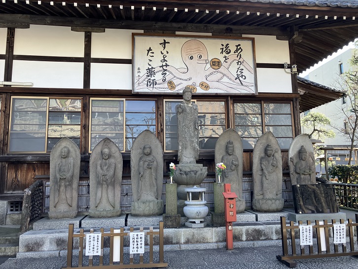 とあるお寺の壁で蛸が踊っています。「たこの吸い出し」の広告ではありません。「たこ薬師」として知られる成就院の看板です。