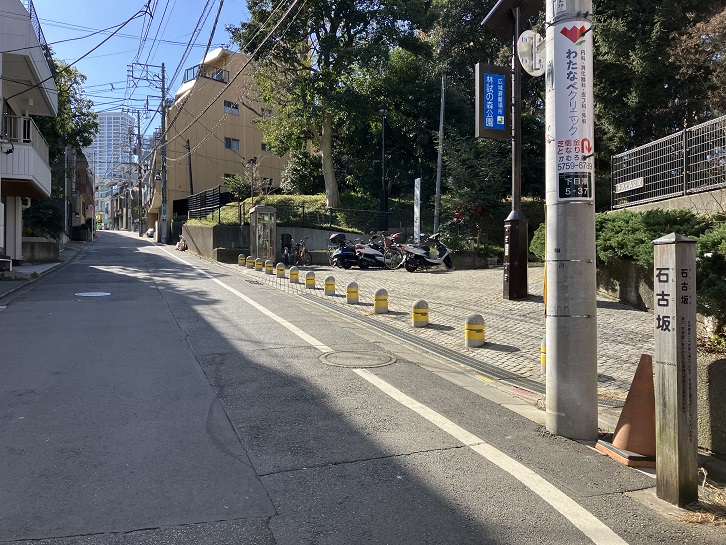 その昔石ころが多い坂だったので、石古坂と呼ぶようになったといわれる。他に、古地図に記された「石河坂」が転じた説などがある。