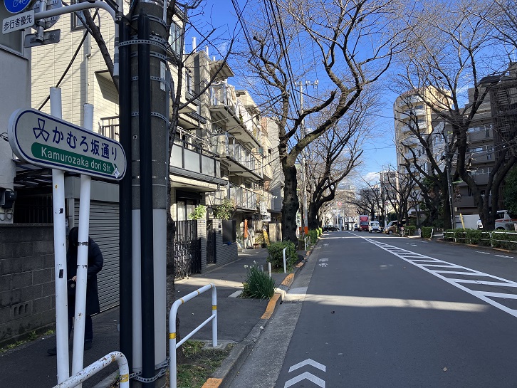 山手通りの「かむろ坂下交差点」から、東急目黒線と並行して南西に上る緩やかな坂道は「かむろ坂通り」と呼ばれています。春になると坂道の両側に植えられた桜並木が品川百景のひとつのお花見の名所となります。