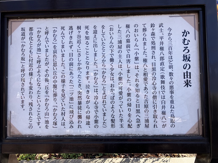 今から三百年ほど前、数々の悪事を重ねた鳥取の武士、平井権八郎直定(歌舞伎では白井権八)が鈴ヶ森で処刑され、目黒の冷心寺の僧に引き取られて葬られました。権八と相愛であった吉原の三浦屋のおいらん「小紫」は、それを知ると目黒へ急ぎ権八の墓前で自害しました。小紫の帰りを心配した三浦屋の主人は、小紫の可愛がっていた半玉(おいらんの下で働く少女は、おかっぱのような髪形をしていたところから「かむろ」とよばれていました)を迎えに出しました。「かむろ」は、冷心寺で小紫の死を知ることとなります。泣きながらの帰途桐ヶ谷近くにさしかかったとき、突然暴徒に襲われ逃げきれず、目の前にあった「二ツ池」に飛び込み死んでしまいました。この様子を見ていた村人は、「かむろ」を哀れに思い丘の中腹に葬り、「かむろ塚」と呼んでいましたが、その後、丘を「かむろ山」池を「かむろが池」と呼ぶようになったということです。都市化とともに付近の様子も変わり、残されたこの坂道が「かむろ坂」と呼び残されています。