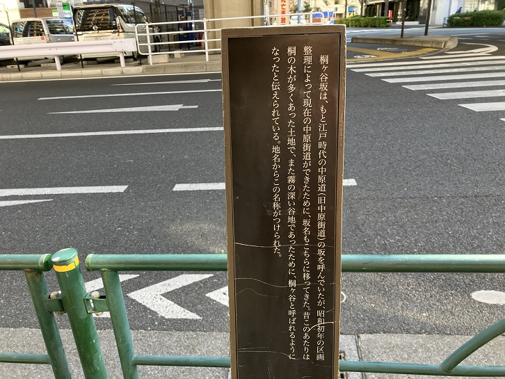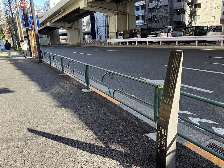 桐ケ谷坂は長さが約350mほどの坂で、昔この辺りが「桐ヶ谷村」だったことから坂名が付いたといわれています。かっては旧中原街道上にあった坂でしたが、区画整理によって坂名が現在の中原街道に移りました。つまり、坂の位置は変わったのですが、坂名はそのまま引き継いだということです。荏原ランプの手前に案内板が立っています。
