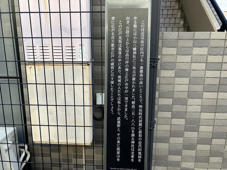 この付近は品川区内でも一番標高の高いところで、明治時代初期に最初の近代的地図を作る際には小山八幡神社に三角点が置かれました。標高35.88mを測る神社は北東を向き、石段の上からは品川沖の海と江戸市中が一望できました。この江戸見坂は集落の中にあり、地域の人たちは坂上から、武蔵野と、その東に筑波山を背に広がる百万都市江戸の威容に日々接したことでしょう。