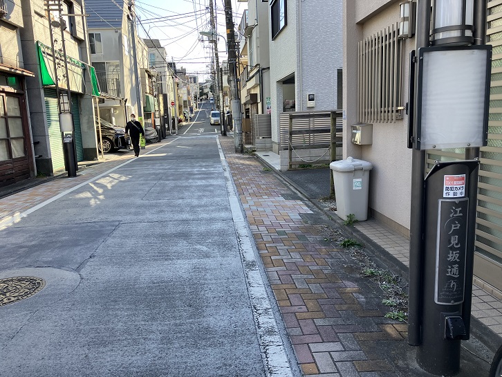 江戸見坂は長さが約120mほどのやや急な坂で、かつて坂上から江戸市中が見渡せたためこの坂名が付いたといわれています。現在は建物に邪魔されて眺望はそれほどでもありませんが。