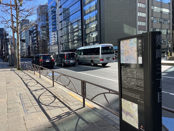 麹町駅出入口3を出て新宿通りを半蔵門方向に進みます。歩道脇に麹町の町名の由来を記した案内板が立っています。