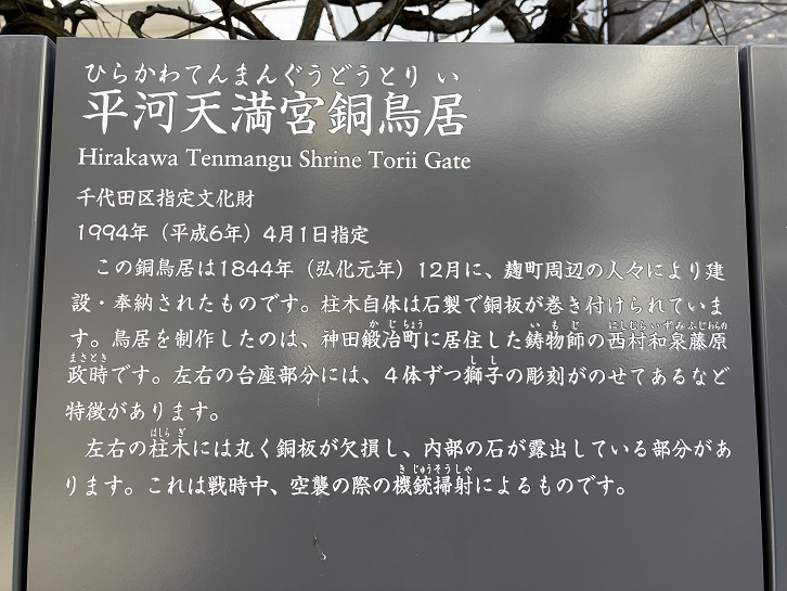 この銅鳥居は弘化元年(1844年)12月に、麹町周辺の人々により建設・奉納されたものです。柱木自体は石製で銅板が巻き付けられています。鳥居を制作したのは、神田鍛冶町に居住した鋳物師の西村和泉藤原政時です。左右の台座部分には、4体ずつ獅子の彫刻がのせてあるなど特徴があります。左右の柱木には丸く銅板が欠損し、内部の石が露出している部分があります。これは戦時中、空襲の際の機銃掃射によるものです。