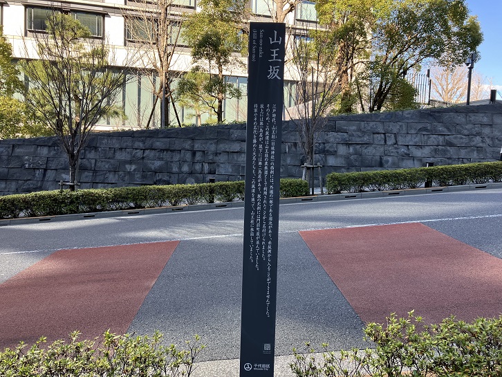 山王切通坂は長さが約280mほどの緩やかな坂で、高台に位置する山王日枝神社と日比谷高校の崖を切り通したことから、この坂名が付けられたと思われます。