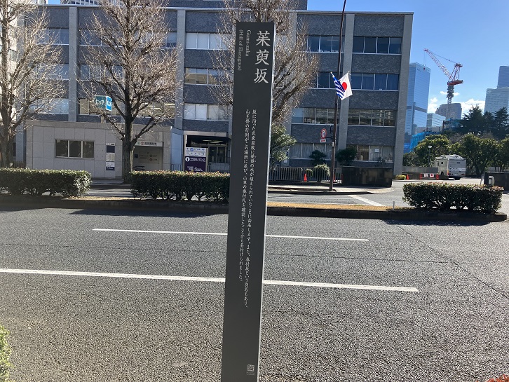 潮見坂は長さが約210mほどの緩やかな坂で、中世の頃までは日比谷公園の辺りまで入江となっていて、眼下に海を望むことができたことからこの坂名が付きました。坂下付近に案内柱が立っています。