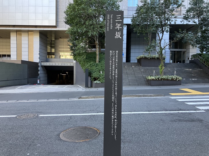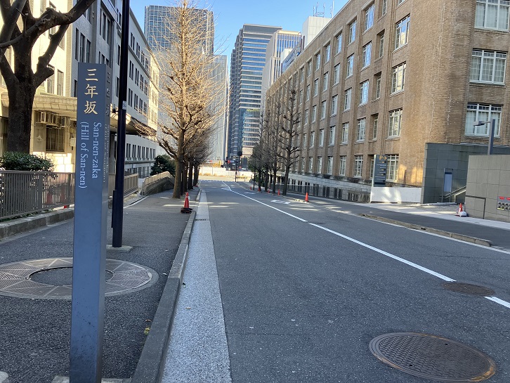 三年坂は長さが約270mほどの緩やかな坂で、別名を「淡路坂・陶山が関・栄螺尻・鶯谷」といいます。坂名の由来は、裏霞が関と三年町の間の坂ということに因んでいます。坂の中ほどの財務省ビルの前に案内柱が立っています。