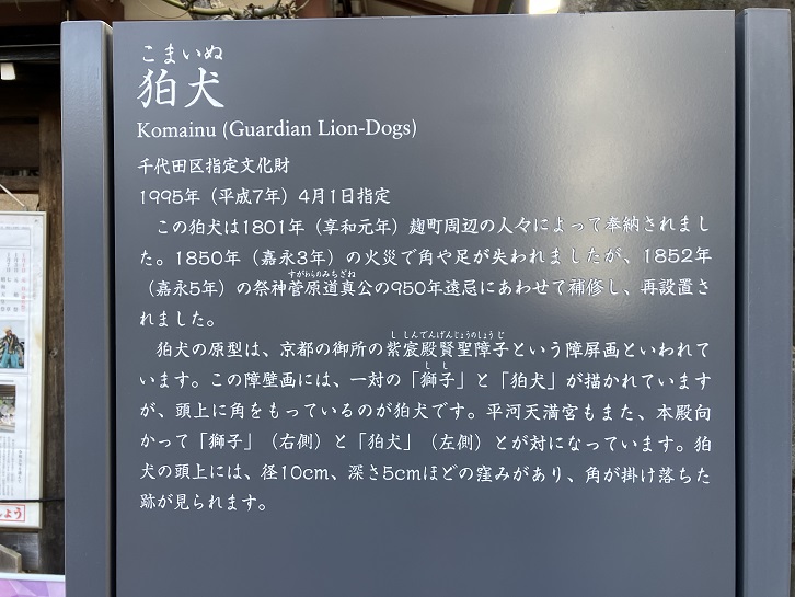 この狛犬は享和元年(1801年)麹町周辺の人々によって奉納されました。嘉永三年(1850年)の火災で角や足が失われましたが、嘉永五年(1852年)の祭神菅原道真公の950年遠忌にあわせて補修し、再設置されました。狛犬の原型は、京都の御所の紫宸殿賢聖障子という障屏画といわれています。この障壁画には、一対の「獅子」と「狛犬」が描かれていますが、頭上に角をもっているのが狛犬です。平河天満宮もまた、本殿向かって「獅子」(右側)と「狛犬」(左側)とが対になっています。狛犬の頭上には、径10cm、深さ5cmほどの窪みがあり、角が掛け(欠け?)落ちた跡が見られます。