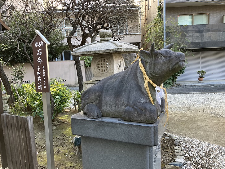 天満宮といえば菅原道真、菅原道真といえば撫牛ですよね。撫牛とは、自分の身体の病んだ部分や具合の悪い部分を撫でた後、牛の座像の置物の同じ箇所を撫でると悪いところが牛に移って病気が治るという信仰習俗のことです。