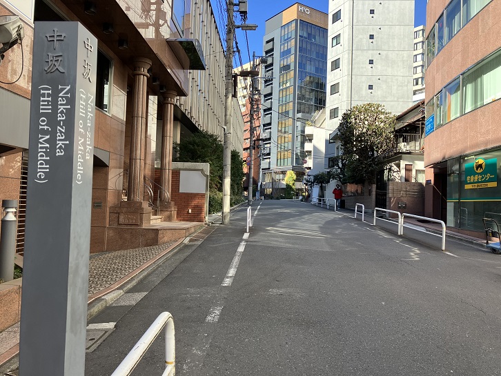 中坂は長さが約90mほどの緩やかな坂で、江戸時代には北側に町屋・南側に武家屋敷が建ち並んでいて、その間の坂だったためにこの坂名が付いたといわれています。坂の中ほどに案内柱が立っています。