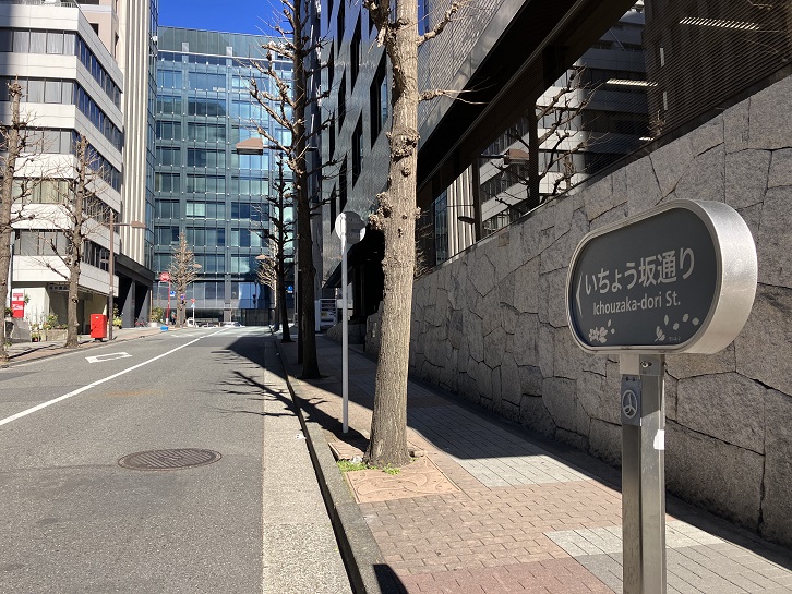いちょう坂は長さが約80mほどのやや急な坂で、坂の両側に銀杏の木が植えてあることから坂名が付けられたと思われます。案内柱は立っていませんが、「いちょう坂通り」の標識があります。