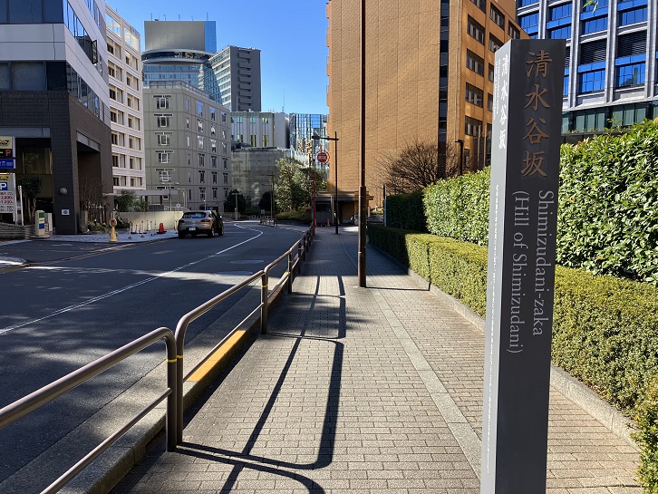 日比谷高校の通用門横から急角度で坂が下っています。23区内の坂では最も急な坂のひとつでしょう。