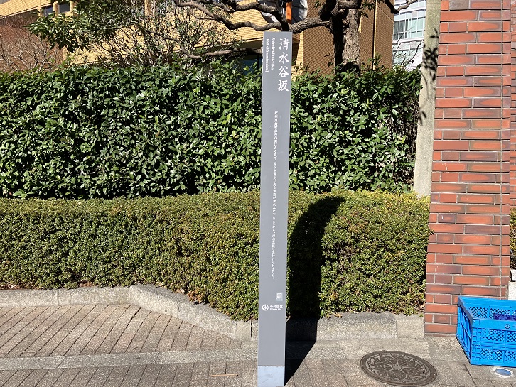 清水谷坂は長さが約190mほどの左右に曲がりながら下る緩やかな坂で、別名を「シダニ坂・シタン坂」といいます。この一帯は清水谷と呼ばれる地名だったため、それが坂名になりました。坂の中ほどに案内柱が立っています。