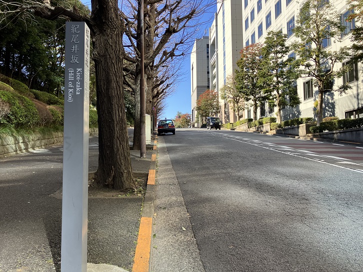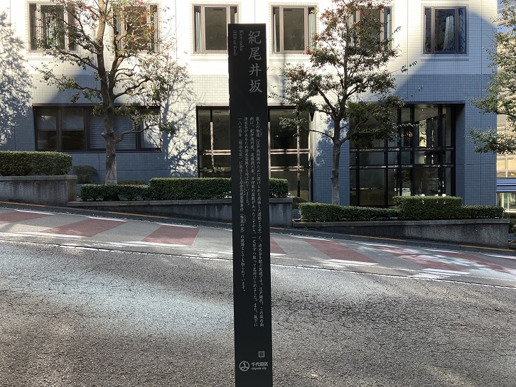 紀尾井坂は長さが約160mほどのやや急な坂で、江戸時代に、紀井家・尾張家・井伊家の三家の邸宅が隣接していたために紀尾井町の町名となり、坂名にもなりました。坂の中ほど近くに案内柱が立っています。