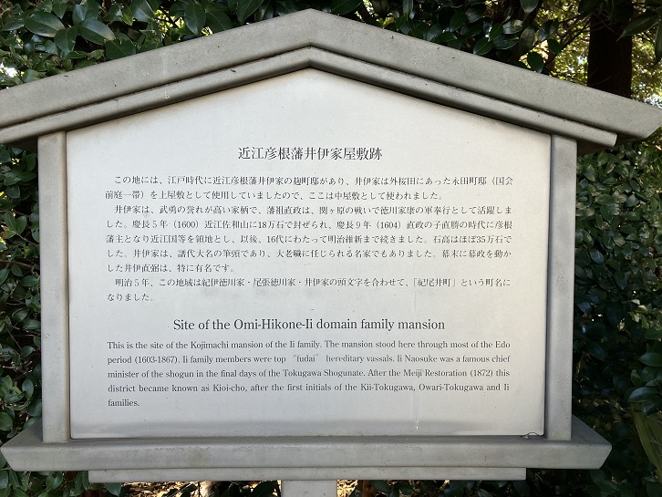 This is the site of the Kojimachi mansion of the Ii family. The mansion stood here through most of the Edo period (1603-1867). Ii family members were top "fudai" hereditary vassals. Ii Naosuke was a famous chief minister of the shogun in the final days of the Tokugawa Shogunate. After the Meiji Restoration (1872) this