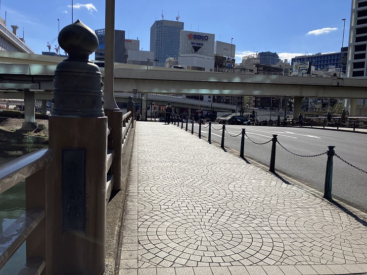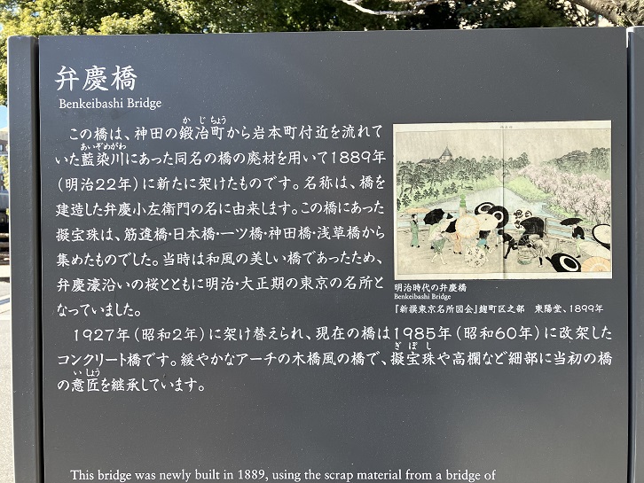 ホテルニューオータニの遊歩道は初めて歩きましたが、なかなかに見応えがありました。できうれば、なだ万でお食事をした後に散策したかったですけど。遊歩道の先はホテルの中を通りますので、普段着のお散歩姿では気恥ずかしい雰囲気です。ホテルを出て弁慶橋を渡ります。橋の入口の横に石碑が建っていて、案内板もあります。