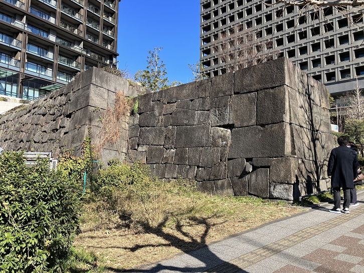 富士見坂の中ほどに赤坂門跡の石垣が残されています。赤坂門は、江戸城から相模大山方面に通ずる大山街道(矢倉沢往還)に建てられた門で、溜池を見下ろす高台上に右折枡形門として築かれ、門前の橋はありませんでした。寛永十三年(1636年)に筑前福岡藩主黒田忠之によって石塁が築かれ、寛永十六年に櫓や門が築かれました。