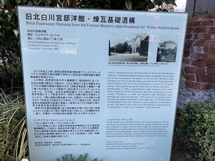 平成二十三年(2011年)、旧李王家東京邸(現・赤坂プリンスクラシックハウス)の保存工事の過程で地中より旧北白川宮邸洋館の煉瓦積基礎が発見された。この地は、紀伊徳川家江戸上屋敷跡で、明治時代になって北白川宮能久親王に下賜され、明治十七年(1884年)に洋館を中心とする大規模な殿邸が建設された。洋館は煉瓦造2階建(一部3階)の壮麗なゴシック建築で、設計者はジョサイア・コンドルであった。その後、北白川宮邸洋館は明治二十七年(1894年)の東京地震によって被害を受け、翌年には能久親王が逝去したことから、3階と西側が撤去縮小され、玄関ポーチも北寄りに移された。明治四十五年(1912年)、北白川宮家は高輪南町の新邸に移転し、跡地には昭和五年(1930年)に李王家東京邸が建設された。発見された煉瓦積基礎には上質の煉瓦が用いられており、目地にセメントを用いた丁寧かつ堅牢な造りであった。この遺構はその一部で、玄関ポーチの独立柱の基礎であったと考えられる。