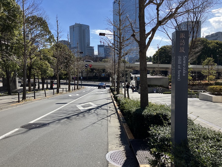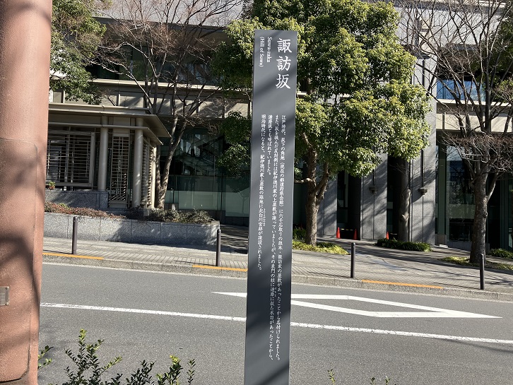 江戸時代、坂下の角地(現在の都道府県会館)に六千石取りの旗本・諏訪家の屋敷があったことから名付けられました。また、板を挟んだ反対側には紀伊徳川家の上屋敷が建っていましたが、その表門の柱に達磨に似た木目があったことから、達磨坂とも呼ばれていました。明治時代になると、紀伊徳川家上屋敷の跡地に北白川宮邸が建設されました。