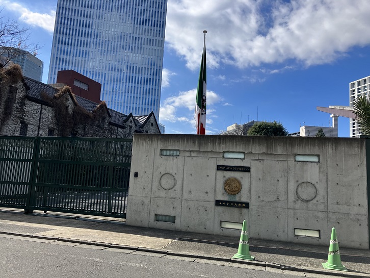 三べ坂の中ほどの交差点を右折して鍵形に進みますと右手にメキシコ大使館の建物があります。