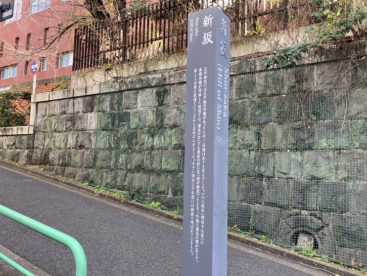 江戸時代には江戸城の外堀があったため、この道はありませんでした。明治十七年(1884年)に参謀本部が作成した地図では、溜池の方へ下る現在の形に近い道が確認できます。外堀と溜池の埋め立てで、新しく出来た坂道ということから名付けられました。すでに明治三十年頃には新坂と呼ばれていました。