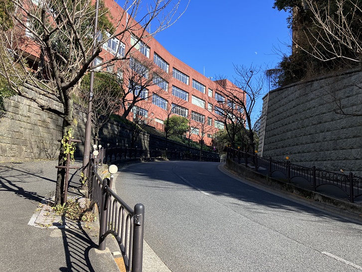 山王切通坂は弧を描いた中ほどの地点が最も盛り上がっていて、その先は下り坂になっています。坂下付近には日比谷高校の正門があります。こちらから入れば遅刻することはありませんね。日比谷高校には正門と通用門のふたつの入口があります。永田町駅と赤坂見附駅からは通用門から入れますが、永田町駅からは下り坂と平坦な道路、赤坂見附駅からは急峻な坂道を上がることになります。一方、国会議事堂前駅からは平坦な道路で正門に入れます。距離は同じようですが、朝の登校時に楽に行くには、国会議事堂前駅→永田町駅→赤坂見附駅の順ですかね。入試の際はご注意を。