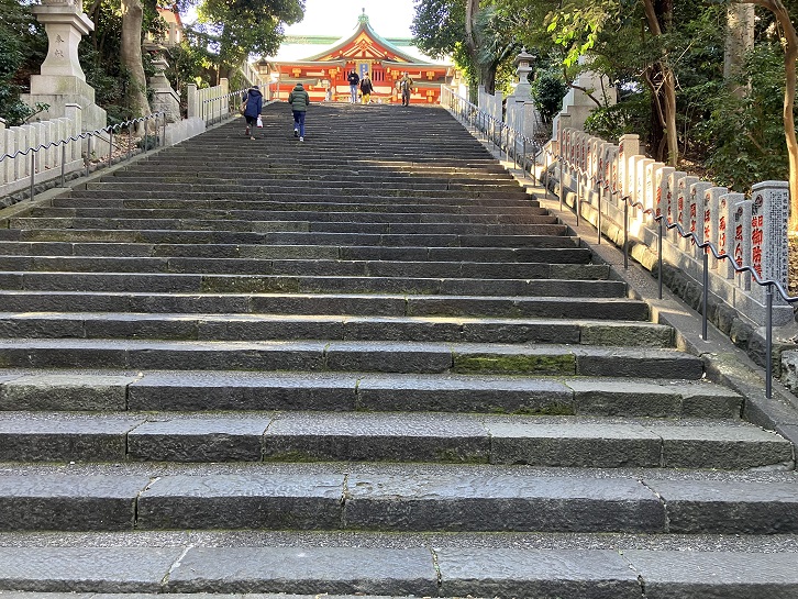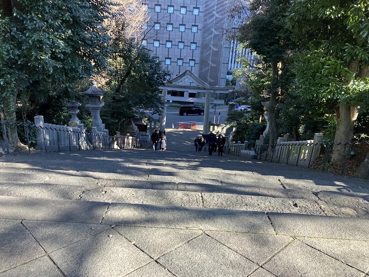 山王切通坂の坂下(日比谷高校の正門前)の右手に急な石段が上がっています。石段の手前には大鳥居が聳えていて、階段の上には朱色も鮮やかな神門が建っています。