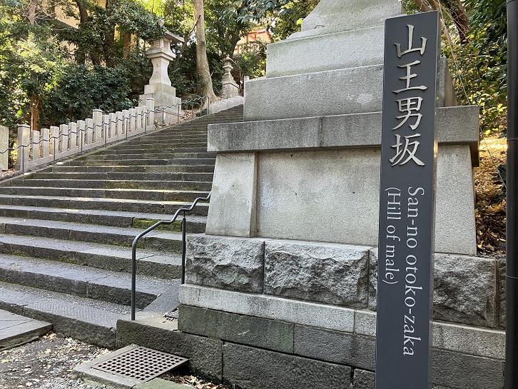 山王男坂は長さが約30mほどの急な石段で、山王日枝神社の表参道になります。外堀通りに面した階段とエスカレーターは山王橋参道で、この他に朱色の千本鳥居が連なる稲荷参道があります。山王日枝神社に上る坂のうち、正面の急な坂であることから、別名男坂のとも呼ばれます。