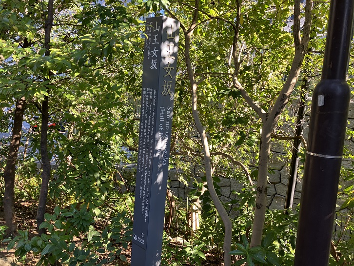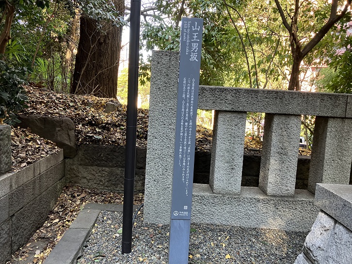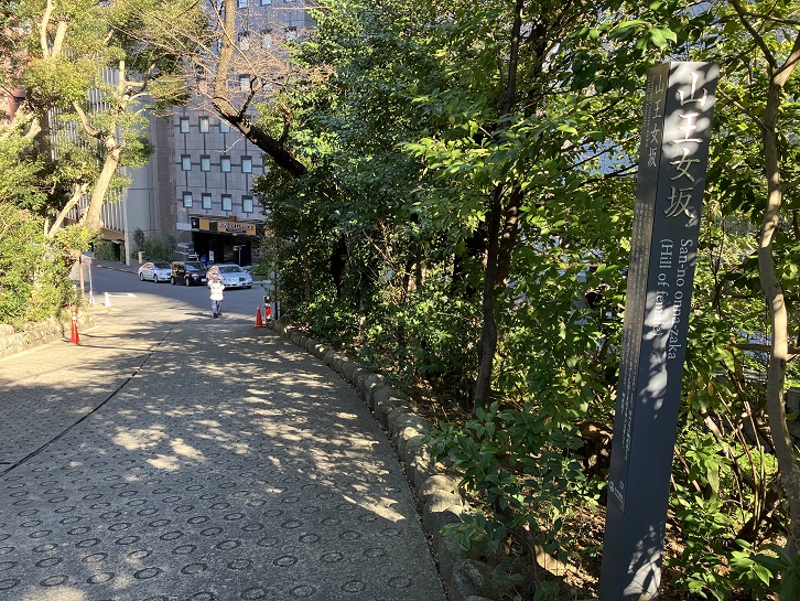 江戸時代、山王社(日枝神社)の西側には、外堀の一部である溜池があり、赤坂側から入ることができませんでした。そのため、この坂道は山王社の表参道として利用されたことから名付けられました。坂上には第一鳥居が、坂下には第二鳥居があり、坂の北側には門前町屋が並んでいました。将軍やその名代を務めた大名たちも、この坂道を通って、山王社に参詣していました。