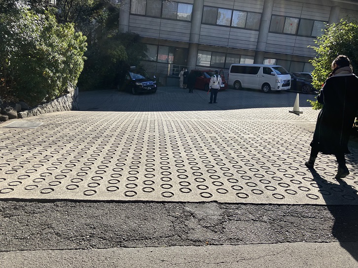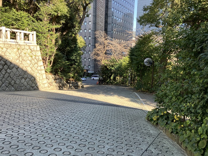 山王男坂の坂上の左手先から急なコンクリート坂が下っています。滑り止めのドーナツ形の凹みも施されていますので、急坂には間違いないです。