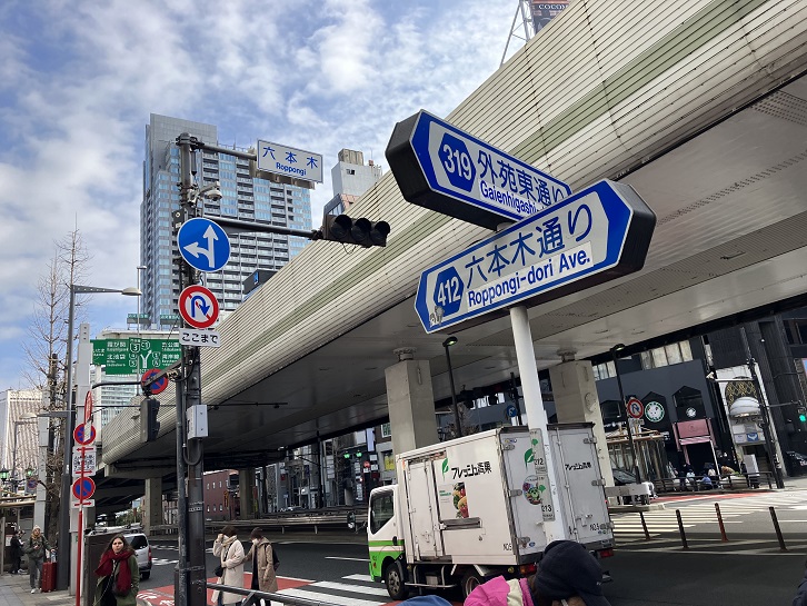 六本木通りに出ます。六本木四丁目交差点の手前から急坂が上っています。