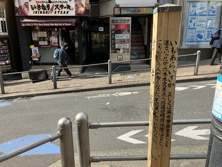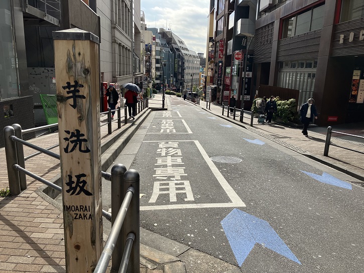 いもあらいざか 正しくは麻布警察署裏へ上る道をいったが、六本木交差点への道が明治以後にできて、こちらをいう人が多くなった。芋問屋があったからという。