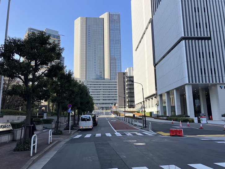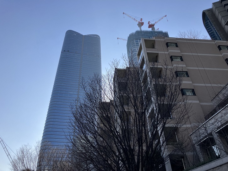 しいのき坂の先には、竣工したばかりの高さ約330mを誇る多用途複合の超高層タワーが聳えています。