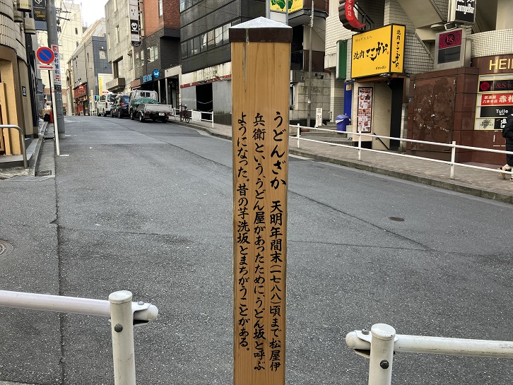 うどんざか 天明年間末(1788年)頃まで松屋伊兵衛という、うどん屋があったために、うどん坂と呼ぶようになった。昔の芋洗坂とまちがうことがある。