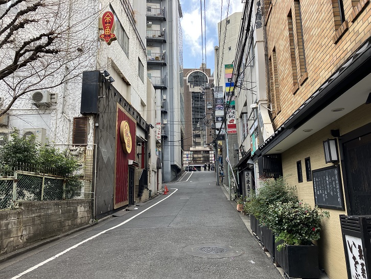 ロアビルと外苑東通りを挟んだはす向かいから、雑居ビルの間を坂が下っています。坂の途中にある「金魚」は日本を代表するシアターレストランで、1994年に開業しました。NEO歌舞伎とも呼ばれています。