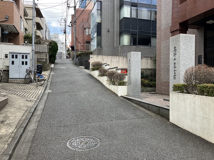 六本木墓苑の東側から民家を挟んで坂が上がっています。