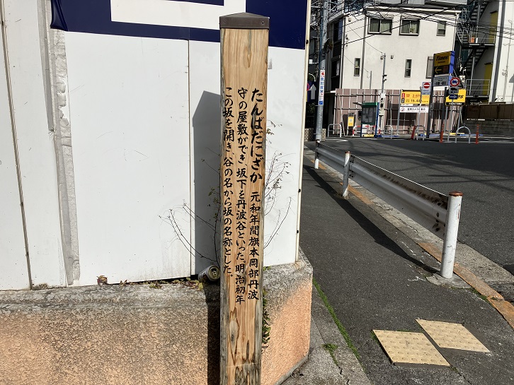 丹波谷坂は長さが約100mほどの急な坂です。江戸時代にこの辺りに旗本岡部丹波守の屋敷があり、丹波谷という地名になりました。そこに新しく坂道を開いたことにより、この坂名が付けられました。坂上と坂下付近に案内柱が立っています。