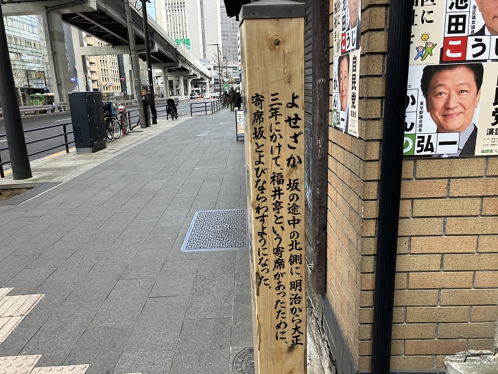 よせざか 坂の途中の北側に、明治から大正三年にかけて、福井亭という寄席があったために、寄席坂とよびならわすようになった。
